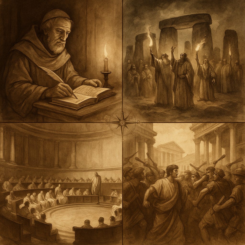Two origin stories open our series: Britain’s myths and Rome’s machinery. Bede and Geoffrey of Monmouth hand us legend—Albion renamed for a Trojan castaway; a past constructed for meaning. Useful, but not the whole story. The other lens is institutional: the Roman Republic’s language of assemblies, magistrates, and a senate—checks that worked, then frayed.