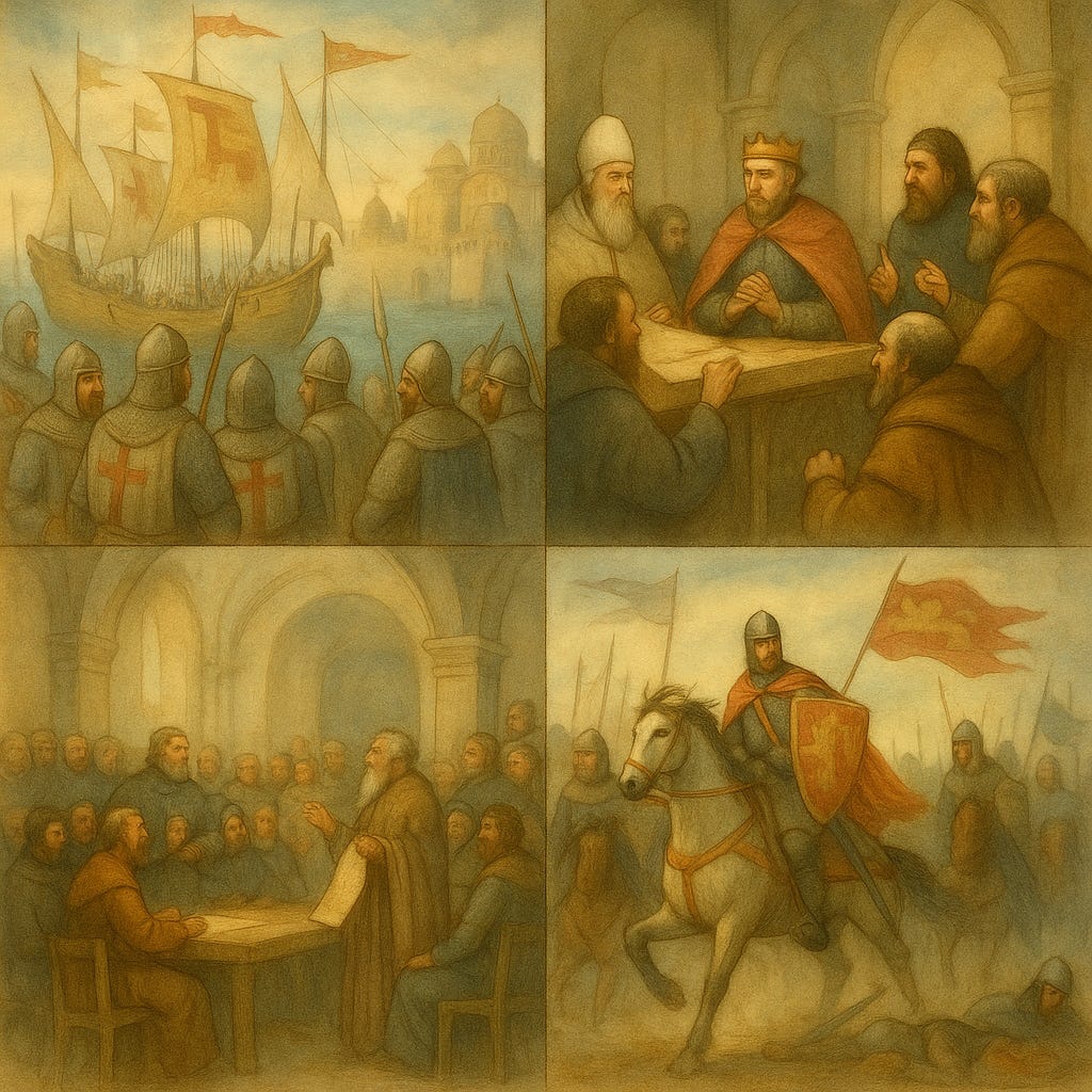 The cold open sends us far from England—to the early Christian East, the Nestorian world, and the strange medieval hope that a distant Christian king, Prester John, might ride out of Asia to save Jerusalem. These stories remind us how wide medieval imagination could stretch, even as Europe struggled to hold its own frontiers. They also set the stage for the disasters and disillusionment of the Fourth and Fifth Crusades, which exposed the limits of Crusader ambition and the strains within Christendom itself.