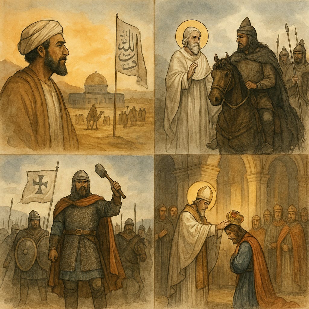In the early seventh century, a new faith takes shape in Arabia. Muhammad’s revelation in Mecca and Medina unites a fractious people into a single community bound by belief. Within a century of his death, Muslim armies carry that vision from Spain to Persia, pressing westward across North Africa and into Iberia. There they meet a different kind of rising power—a Christian Europe reasserting itself under the banner of Rome reborn.